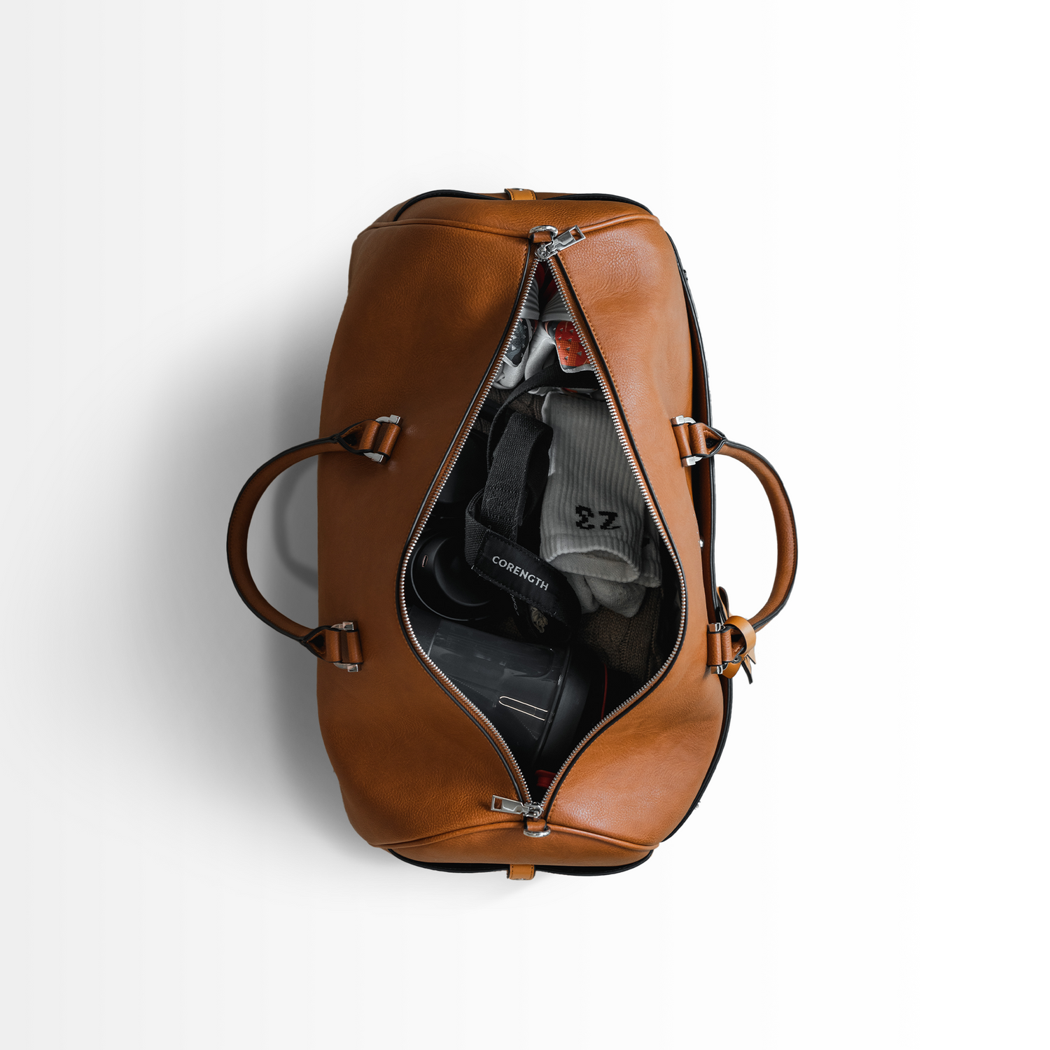 Introducing the ESNTL Duffle - where style meets function. Crafted from the finest vegan leather, this classic and sleek duffle bridges the gap between the office and the gym, and beyond. With its spacious interior, it's perfect for your gym essentials, a weekend trip, or as a traveling bag. The stylish exterior makes it ideal for your everyday commute. Upgrade your collection today with the ESNTL Duffle.
